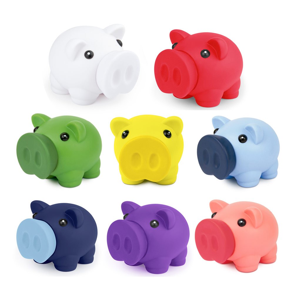 Alcancía con forma de cerdito. La nariz funciona como tapón para vaciar la alcancía.