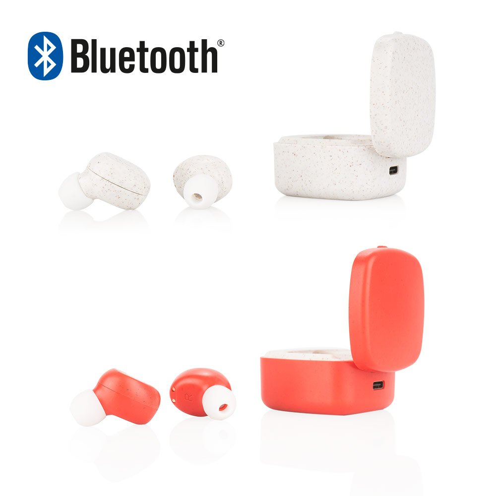 Audífonos Bluetooth 5.1 fabricados con paja de trigo, un material sostenible y amigable con el medio ambiente. Incluyen estuche de carga con batería de polímero de litio de 200 mAh. Ofrecen hasta 4 horas de uso continuo y función de manos libres. Voltaje de carga: 5 V. Diseño compacto y ecológico, ideal para el día a día.