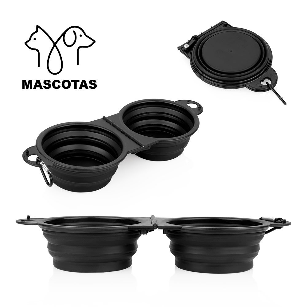 Bebedero de silicona plegable. Gracias a sus 2 compartimentos, puede ser usado para bebida y alimento simultáneamente. Es portátil e incluye gancho carabinero para transportarlo fácilmente. Además, cuenta con 2 pequeños ganchos plásticos de seguridad para evitar derrames. Capacidad: 400 ml / 13 Oz.