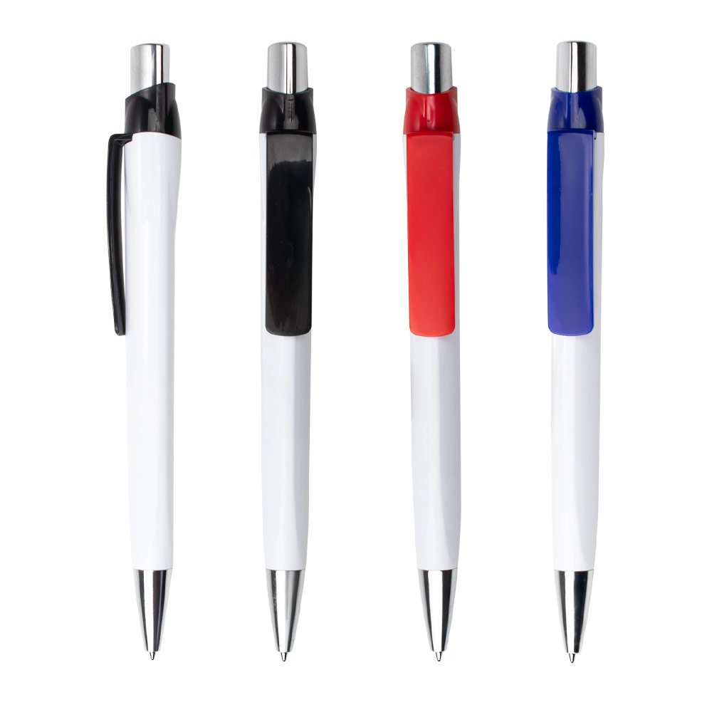 Bolígrafo con barril blanco sólido, clip de color sólido, punta y empujador cromados. Su diseño combina acabados modernos con funcionalidad, ideal para uso diario en entornos laborales o académicos.