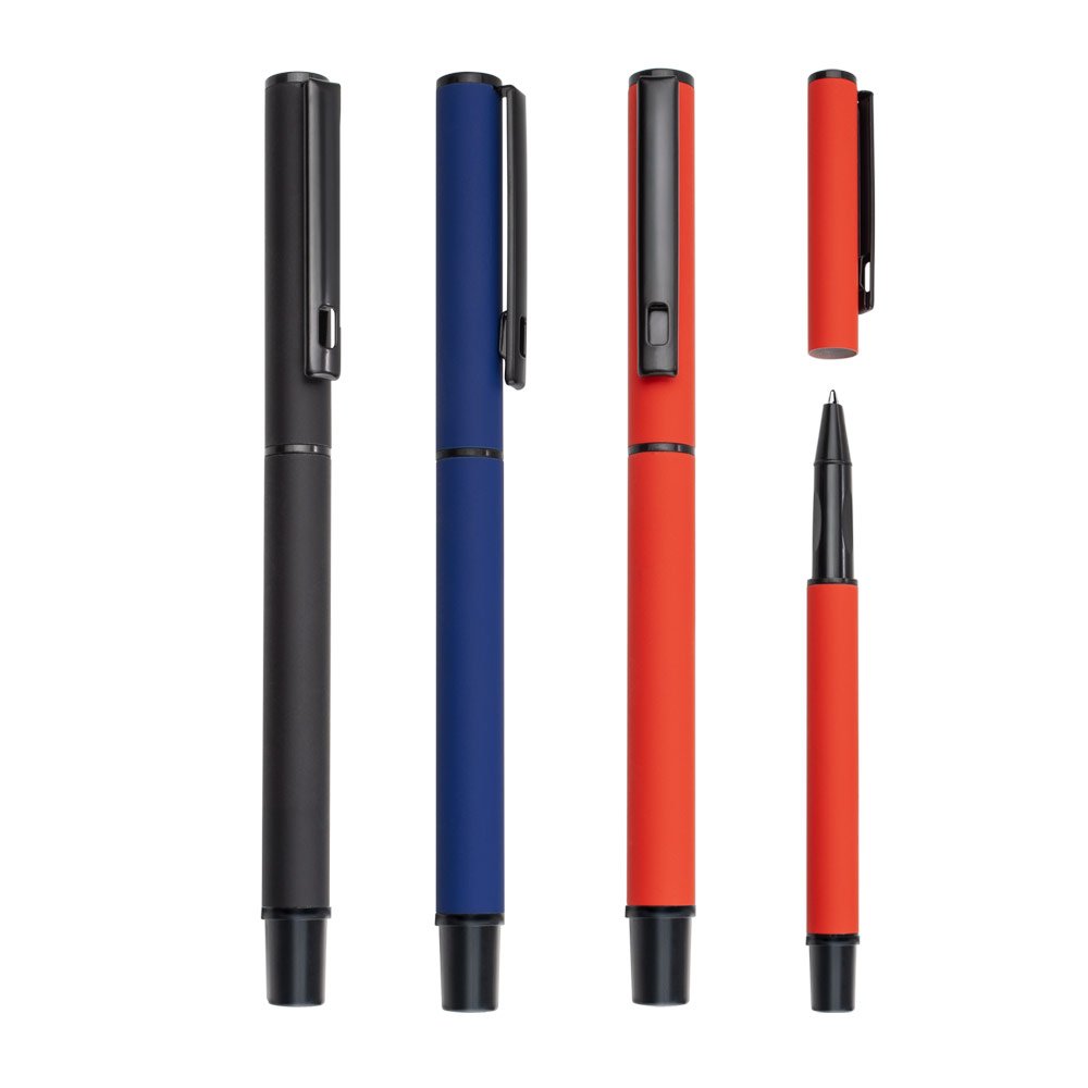 Bolígrafo con cuerpo de aluminio de color engomado con tapa, clip negro y adornos. (Bolígrafo/Esfero)