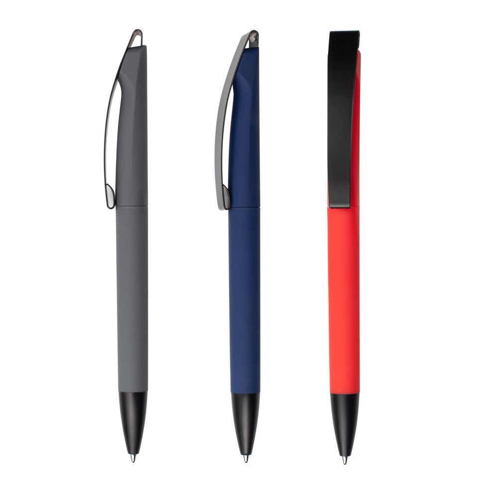Bolígrafo con cuerpo en plástico ABS y barril engomado de color, que ofrece un agarre cómodo y seguro. Su punta negra mate aporta un acabado moderno, mientras que el clip de metal negro con base cromada permite sujetarlo fácilmente a cuadernos, bolsillos o carpetas. Ideal para uso diario en entornos laborales o académicos.