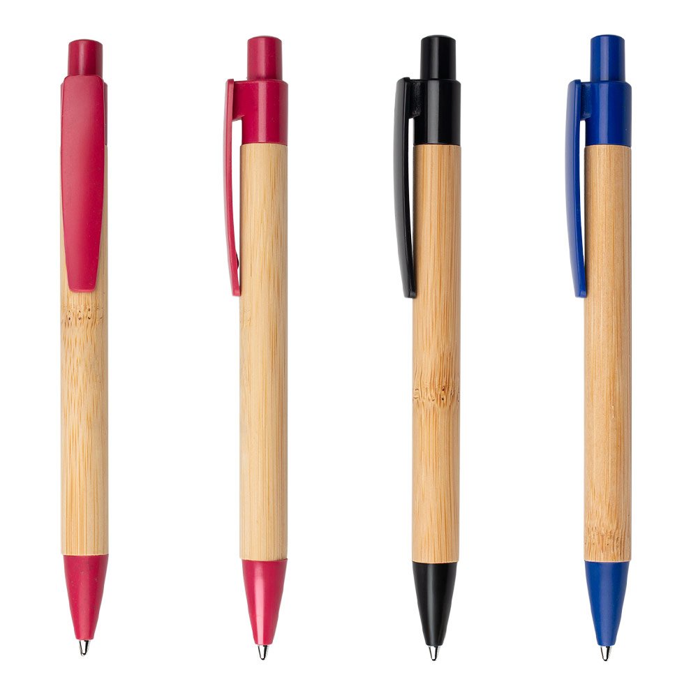 Bolígrafo retráctil con barril de bambú y detalles en paja de trigo de color en el clip, botón y punta, elaborado con materiales reciclados para un diseño sostenible y moderno. Ideal para quienes buscan funcionalidad y compromiso con el medio ambiente, disponible en atractivos tonos que aportan un toque natural y elegante.