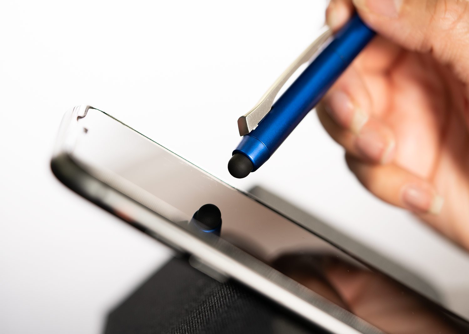 Bolígrafo plástico con sistema retráctil. Clip metálico y puntera touch para dIspositivos con pantallas táctiles. (Bolígrafo/Esfero)