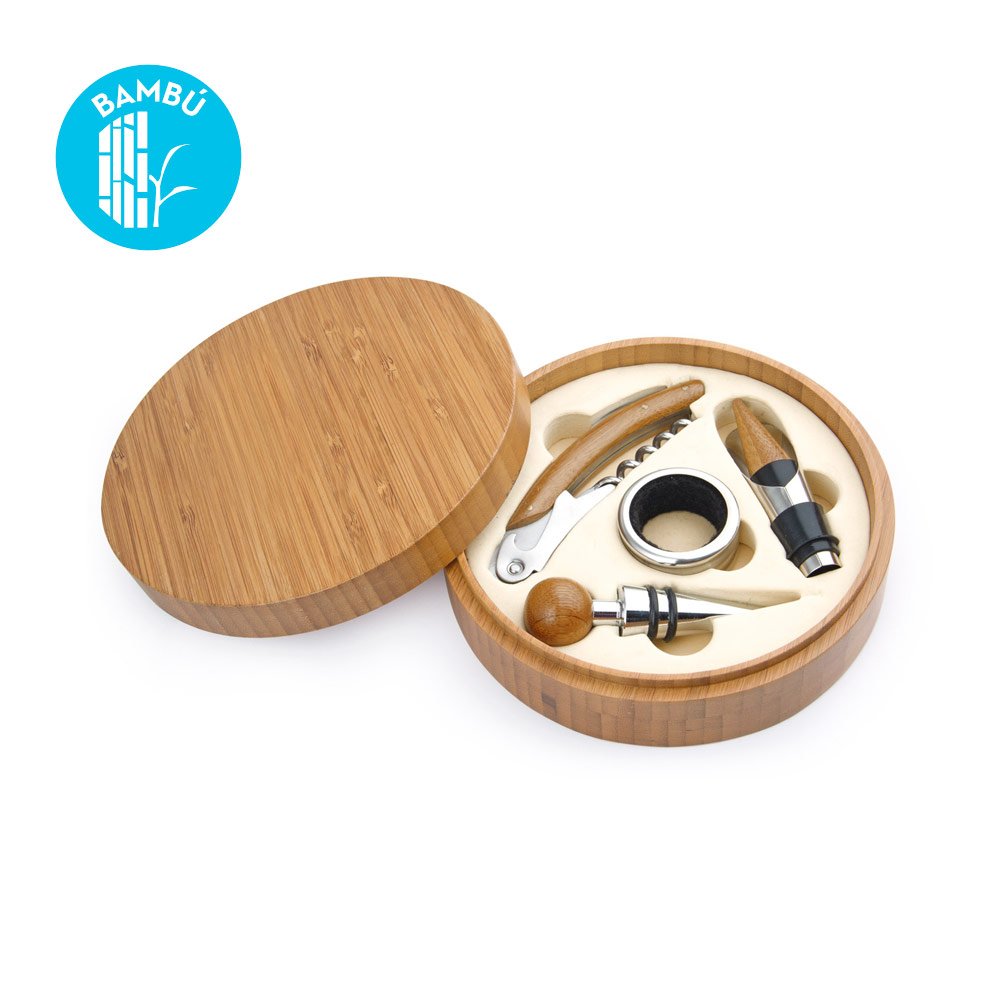 Contiene 4 accesorios de bar con aplique en madera: Tapón para botella, cortagotas, aro antigoteo, sacacorchos de 1 tiempo. Caja interior beige.