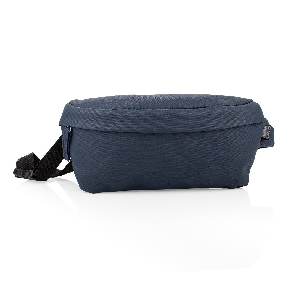Canguro de un solo bolsillo de cierre con cremallera. Tirante para cargar con hebilla plástica, ajustable. Fabricado en RPET.