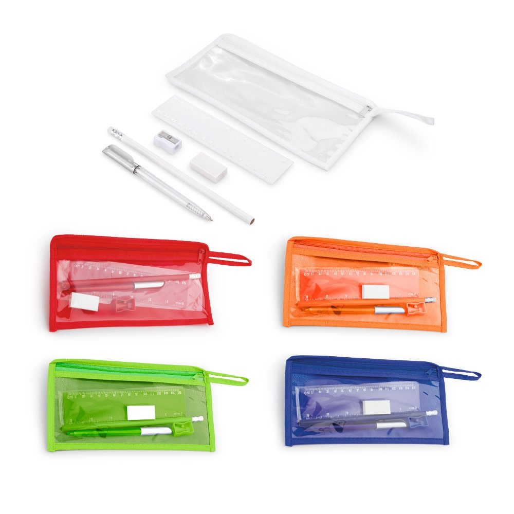 Cartuchera escolar. Incluye lápiz, bolígrafo, borrador, tajalápiz y regla de 15 cm.