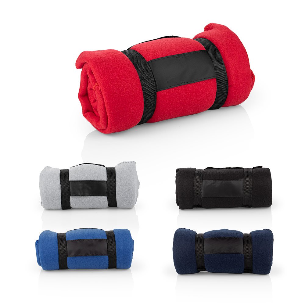 Manta viajera en lana suave con correa en nylon para ajuste y transporte, Peso: 170-180g, ideal para llevar en viajes.