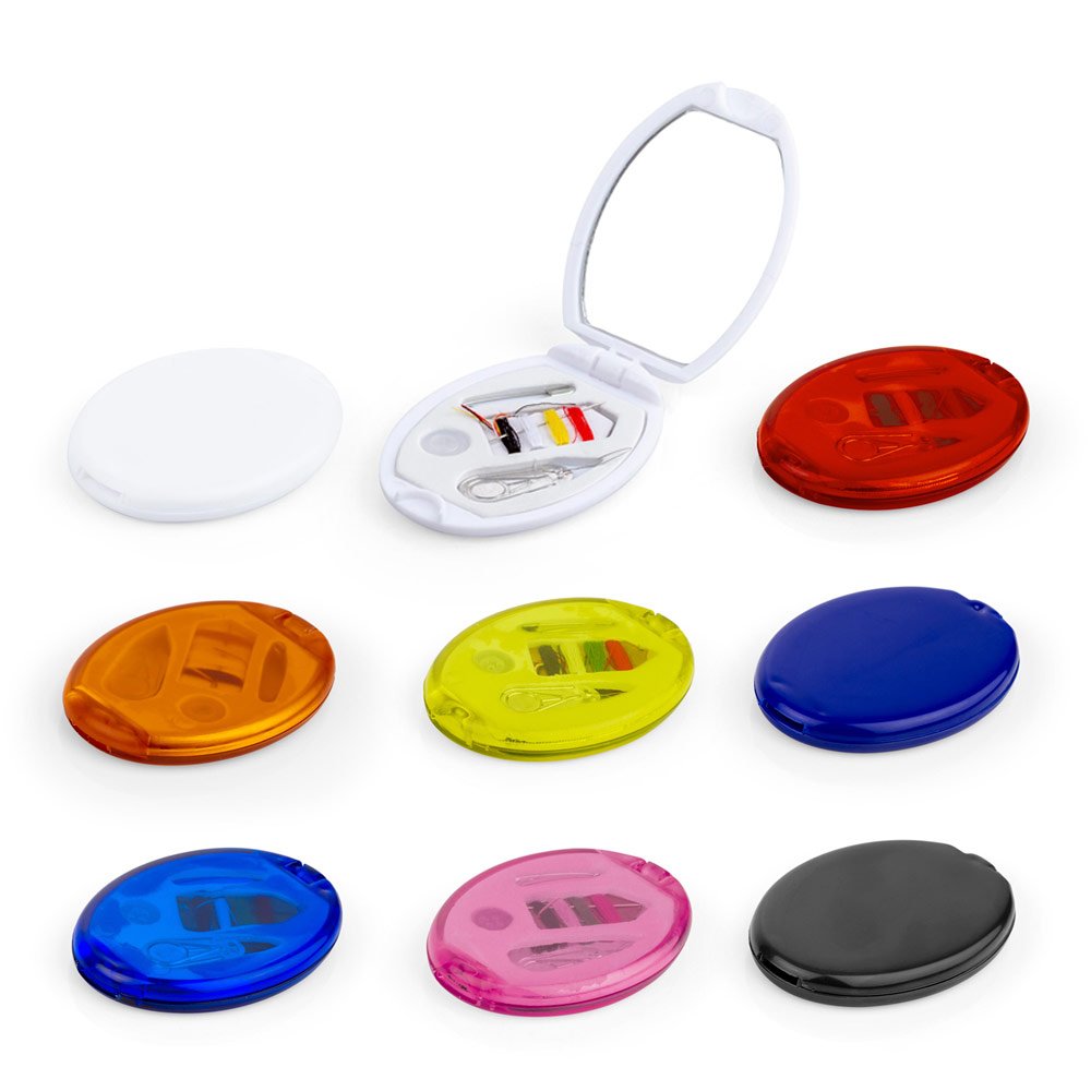 Minicosturero con espejo. Incluye hilos de colores, aguja, gancho nodriza, enhebrador y botón.
