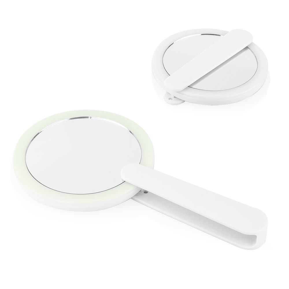 Espejo de maquillaje plegable con luz LED integrada. Cuenta con una sola luz que se activa al mover el agarre hacia un lado y se apaga automáticamente al plegar el espejo. Su diseño compacto lo hace ideal para llevar en el bolso o usar en espacios reducidos, ofreciendo iluminación práctica para retoques precisos.