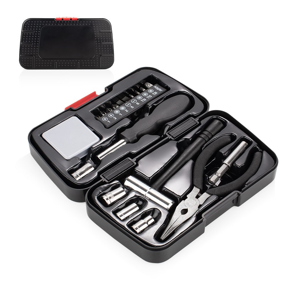 Set de herramientas que incluye: destornillador con 4 puntas tipo phillips, 2 tipo pala, 3 de precisión y 1 adaptador de copa. 1 extensor, 4 copas de 10, 9, 8 y 7 mm, pinza con cortafríos, martillo y cinta métrica de 102 cm y 40 pulgadas.