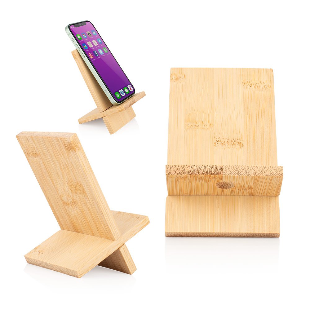 Holder para celular elaborado en bambú, compuesto por dos piezas que se ensamblan fácilmente para formar una base estable. Incluye un orificio funcional que permite el paso del cable de carga o mejora la estabilidad del dispositivo. Compacto y ecológico, ideal para mantener el teléfono en posición vertical sobre escritorios o mesas.