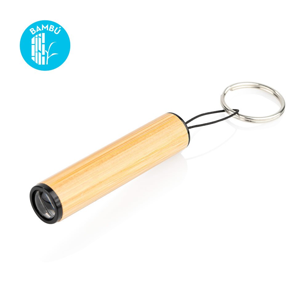Mini linterna LED con revestimiento de bambú, pequeña y fácil de usar. Incluye aro para llaves.