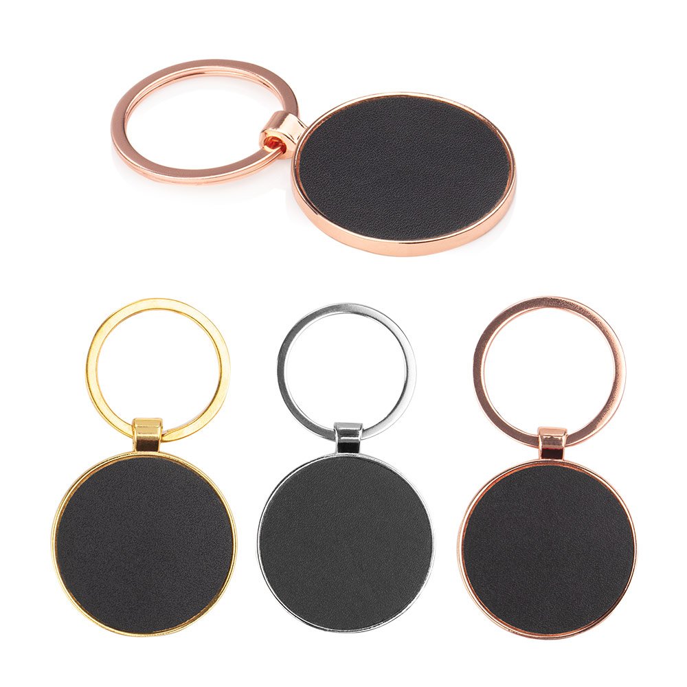 Llavero metálico con forma redonda. Superficie oscura para marcación.