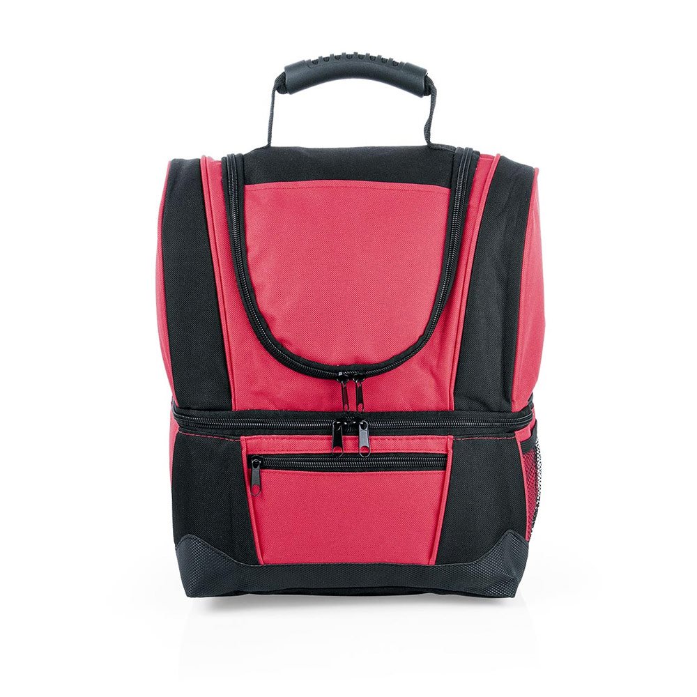 Lonchera de doble compartimiento con manija reforzada, recubrimiento interno y separador en malla de PVC, resistente a la humedad; al exterior bolsillo frontal con cremallera y bolsillo lateral libre en malla. El compartimiento posterior tiene capacidad para llevar hasta 12 latas de bebidas.