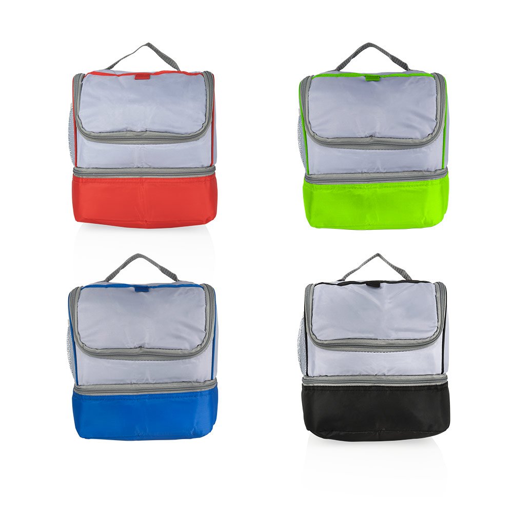 Lonchera de doble compartimento con manija reforzada y recubrimiento interno en PEVA que no es nocivo para la salud, además, es resistente a la humedad.