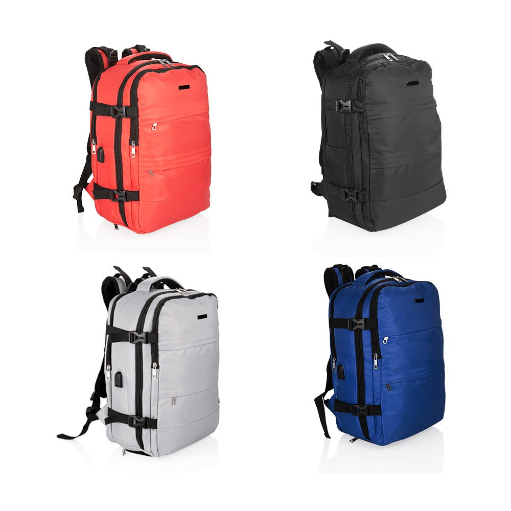 La maleta ideal para viajes en avión. Sus medidas (alto x ancho x profundidad) son aptas para la mayoría de vuelos, como equipaje de mano. Su bolsillo principal, de gran tamaño, se puede abrir hasta 180 grados lo que permite empacar fácilmente. Además, su diseño es multifuncional; incluye un compartimento especial para zapatos y un bolsillo frontal impermeable que se puede utilizar para artículos húmedos. Dotada con un puerto de carga USB que se puede conectar a un multicargador, así como varios bolsillos adicionales de diferentes tamaños y para distintos propósitos. Volumen aproximado: 24 litros.