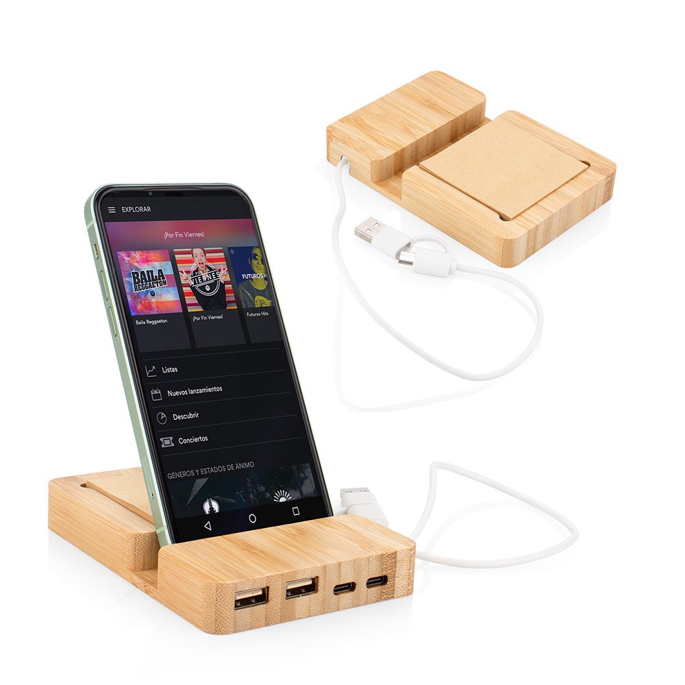 Multipuerto de bambú con soporte para teléfono y notas adhesivas. 2 entradas Tipo C, 2 entradas USB. 1 salida tipo C o USB.