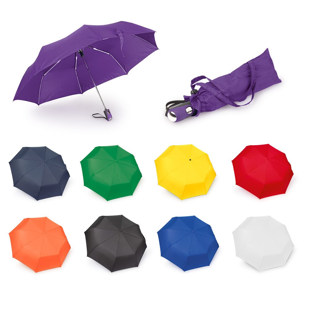 Paraguas de 3 secciones con eje metálico y varillas de fibra de vidrio. Apertura automática y cierre manual. Diseño antibrisa. Incluye funda en la misma tela del paraguas con cordón ajustable. (Paraguas/Sombrilla)