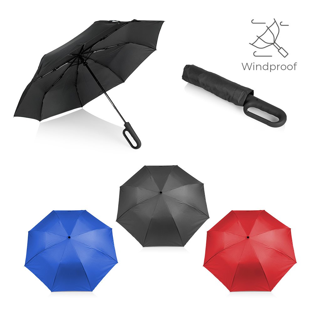 Paraguas de alta calidad confeccionado con tela Pongee 190T, resistente al viento. Cuenta con eje metálico y varillas en fibra de vidrio. Sistema de apertura y cierre automático con botón, agarre ergonómico y gancho retráctil. Incluye estuche individual. (Paraguas/Sombrilla)