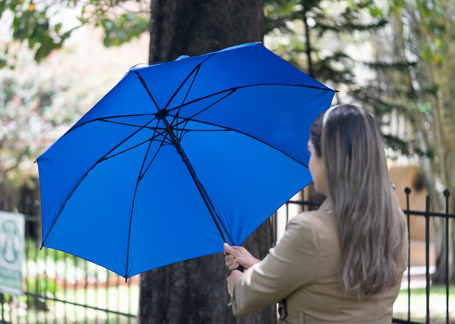 Paraguas tipo recto de 23″ con apertura automática. Varillas de fibra de vidrio, con eje central metálico de color negro. Diseño windproof (resistente al viento) que proporciona mayor estabilidad en condiciones climáticas adversas. Mango curvo de plástico PP con acabado tipo goma (soft touch). Puntas y remate superior plásticos.