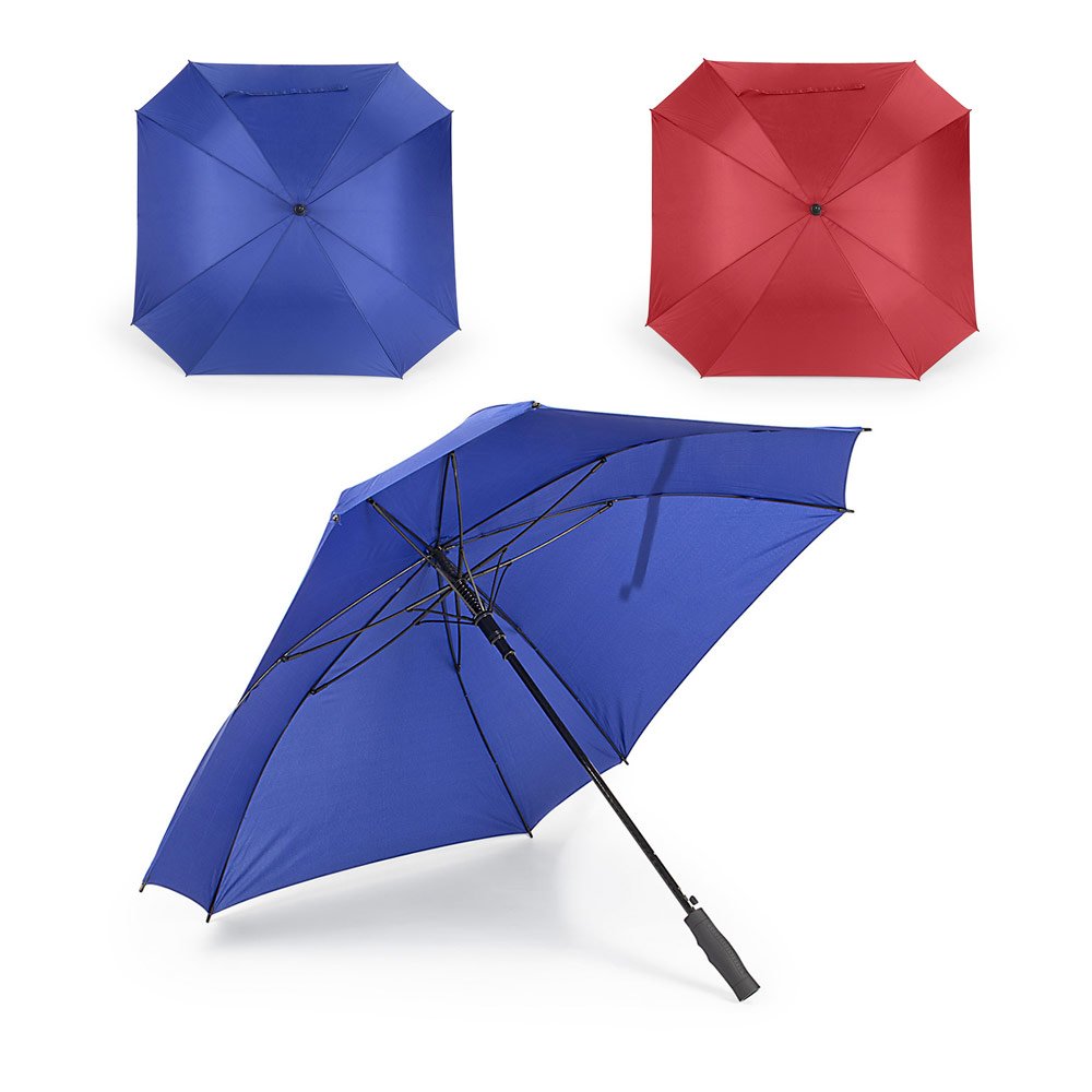 Paraguas cuadrado tipo Golf de 27” con sistema de apertura automática, 8 cascos, eje y varillas en fibra de vidrio, mango en ABS con acabado de caucho, pongee 190t. (Paraguas/Sombrilla)