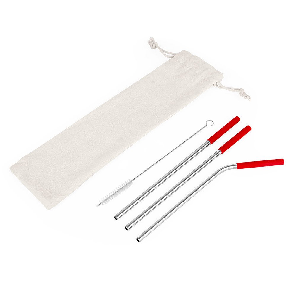 Set de pitillos ecológicos x 3 und (uno de ellos es curvo), con boquilla en silicona, cepillo para limpiarlos y estuche textil con cordón. Producto de uso personal. No se aceptan devoluciones.