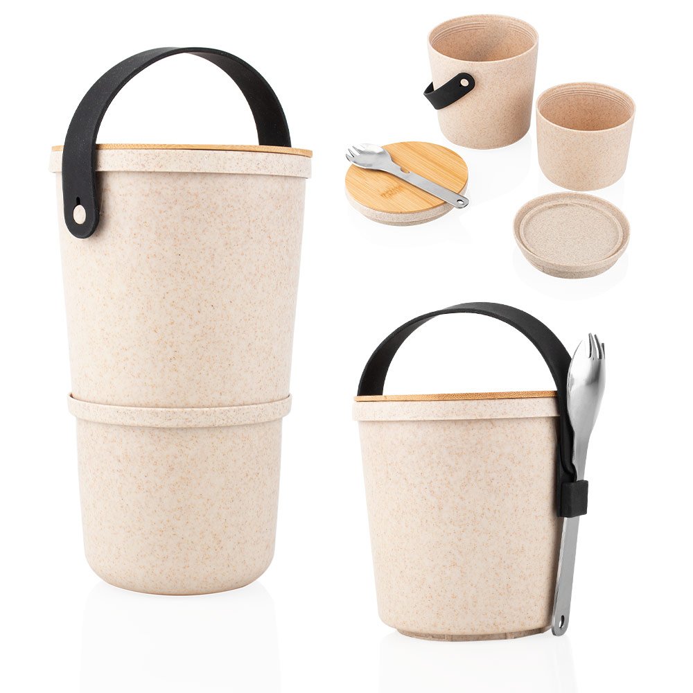 De plástico con tapa de bambú, diseñada con asa integrada para facilitar su transporte. Incluye un portacomidas interno con tapa (8,4 X Ø 9,5) sin tapa: (7,5 X Ø 9,5), ideal para separar y organizar los alimentos. Las tapas cuentan con cierre giratorio que asegura un ajuste firme. El tenedor (3,7 X 14,5), además de ser funcional, incorpora un destapador de botellas y puede colocarse en el asa para mayor practicidad. Una solución versátil y ecológica para llevar tus comidas a cualquier lugar.