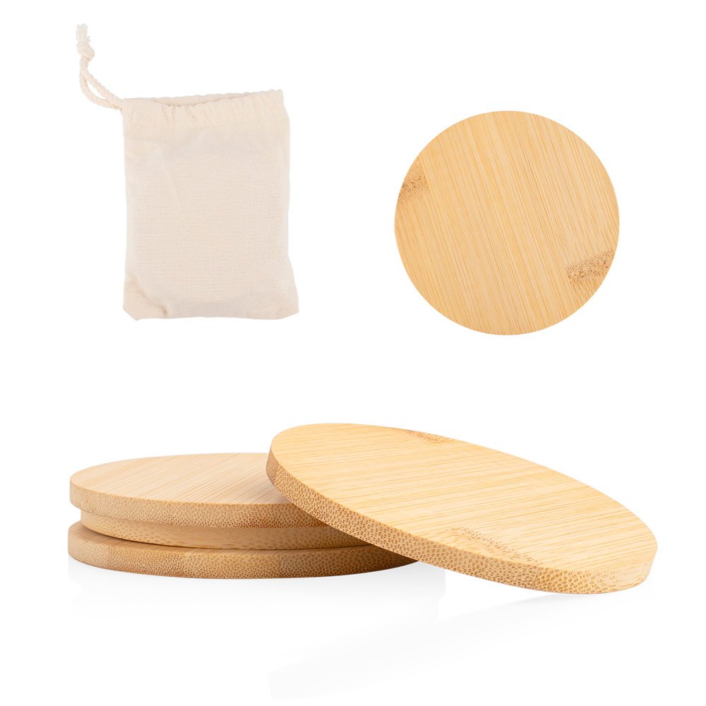 Juego de 4 portavasos hechos en madera de bambú empacados en bolsa de algodón.