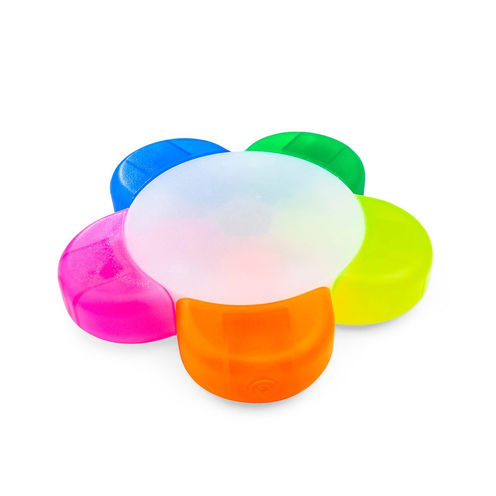 Resaltador con forma de flor, con 5 colores de tinta: azul, rosado, naranja, amarillo, verde.