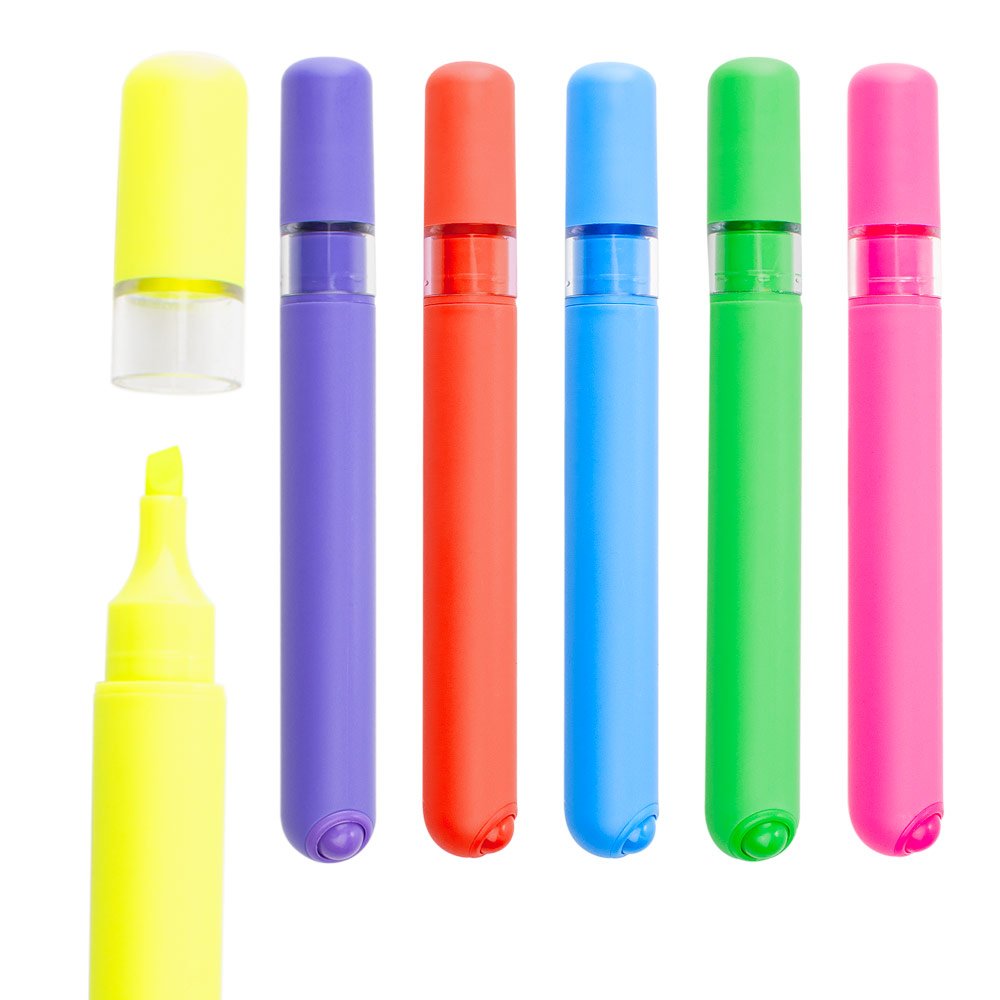 Resaltador plástico con cuerpo de color sólido con ribete transparente, con una mini bola antiestres, perfecta para entretenerse.