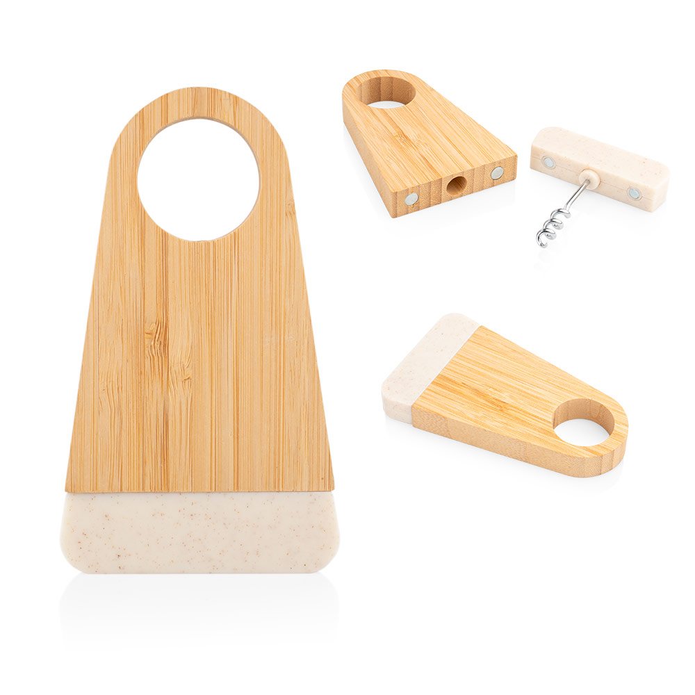Elegante soporte de bambú que incluye un abridor de botellas elaborado en fibra de paja de trigo. Ambos elementos se mantienen unidos gracias a un imán integrado.