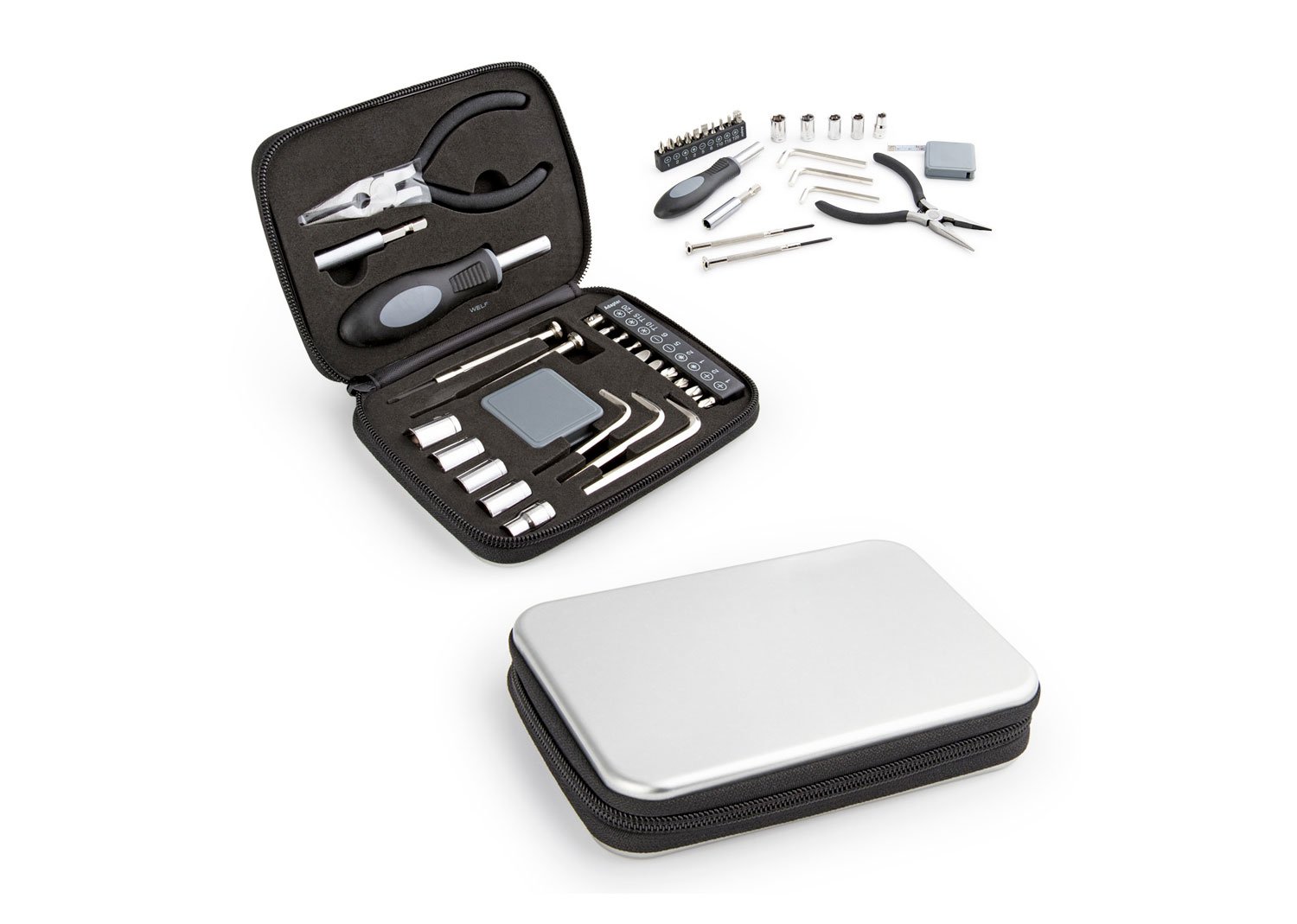 Set de herramientas en estuche metálico con cremallera. Incluye 10 puntas ajustables de diferentes formas, 5 copas, 2 destornilladores de precisión, pinza con cortafríos, 3 llaves allen y cinta métrica de 1 metro / 39 pulgadas.