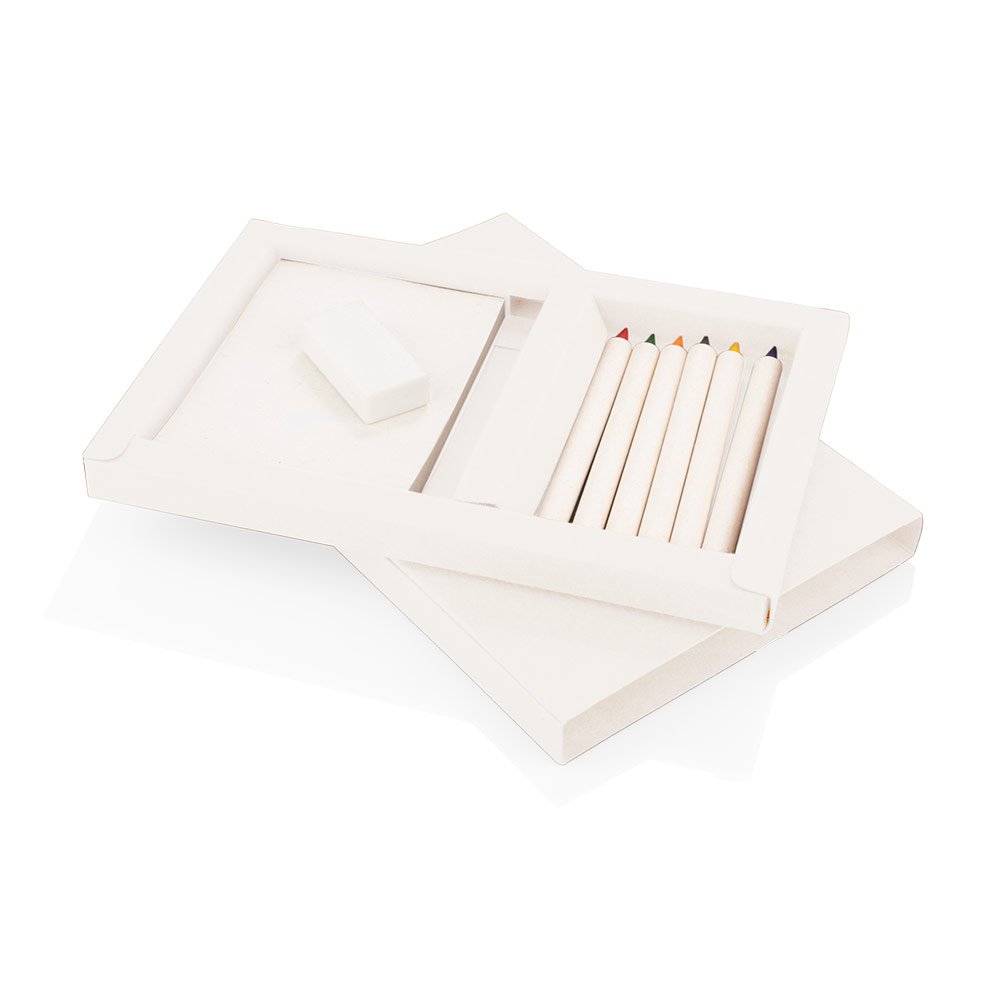 Set de 6 lápices de colores (amarillo, rojo, naranja, verde, negro, azul oscuro) hechos en cartón tipo leche (9 X Ø 0,5), 1 borrador (1,8 X 3,5 X 1) y 1 bloc de notas de 60 hojas con diseño a juego (6,5 X 8,9 X 0,6).