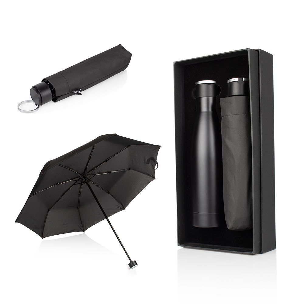 Paraguas/Sombrilla X 8 Cascos (34). Cobertura: (Ø 111). Largo: (66,1). Diámetro Vara: (Ø 0,8). Funda Paraguas: (9 X 22) y botella de acero inoxidable de doble pared con Tapa: (26,1 X Ø 4,9). Sin Tapa: (25,4 X Ø 4,9), presentados en una elegante caja de regalo. La tapa de la botella incluye un gancho con función de agarre. La botella tiene una capacidad de 550 ml / 19 Oz.