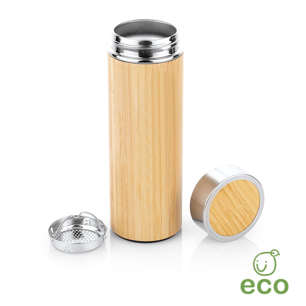 Termo con estructura de doble pared en acero inoxidable, diseñado para conservar la temperatura de las bebidas. Su pared externa está recubierta en bambú natural, lo que le aporta un acabado elegante y ecológico. Incluye infusor con filtro para preparar bebidas directamente en el termo, y una tapa con cierre giratorio también recubierta en bambú. Ideal para bebidas calientes o frías en cualquier entorno. Capacidad: 550 ml / 19 Oz.
